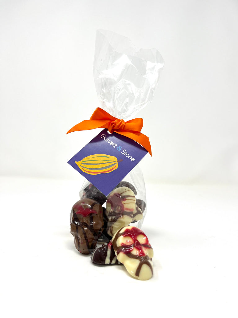 Solid chocolate skulls in milk, dark and white chocolate. Hand made by our chocolatiers just for Halloween.....