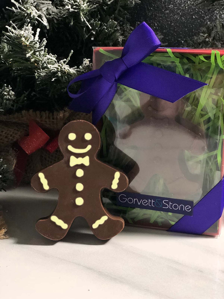 Solid chocolate gingerbread man, flavoured with gingerbread spices and handmade by our chocolatiers.